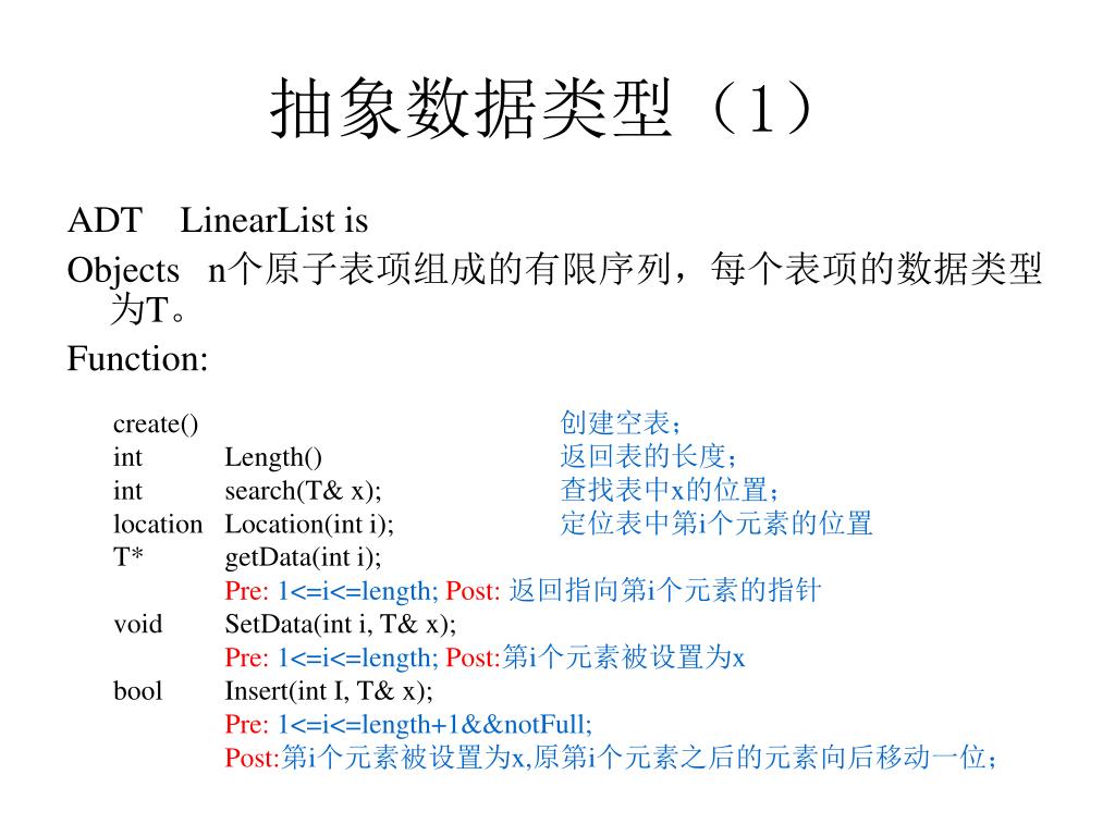 抽象数据类型(1) ADT LinearList is Objectsn个原子表项组成的有限序列,每个表项的数据类型为T。 Function: create() 创建空表; int Length() 返回表的长度; int search(T& x); 查找表中x的位置; location Location(int i); 定位表中第i个元素的位置 T* getData(int i); Pre: 1<=i<=length; Post:返回指向第i个元素的指针 void SetData(int i, T& x); Pre: 1<=i<=length; Post:第i个元素被设置为x bool Insert(int I, T& x); Pre: 1<=i<=length+1&¬Full; Post:第i个元素被设置为x,原第i个元素之后的元素向后移动一位;