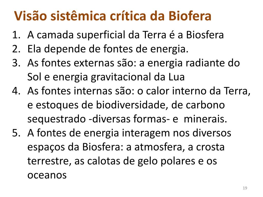 Visão sistêmica crítica da Biofera A camada superficial da Terra é a Biosfera Ela depende de fontes de energia. As fontes externas são: a energia radiante do Sol e energia gravitacional da Lua As fontes internas são: o calor interno da Terra, e estoques de biodiversidade, de carbono sequestrado -diversas formas- e minerais. A fontes de energia interagem nos diversos espaços da Biosfera: a atmosfera, a crosta terrestre, as calotas de gelo polares e os oceanos