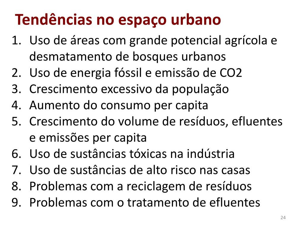 Tendências no espaço urbano Uso de áreas com grande potencial agrícola e desmatamento de bosques urbanos Uso de energia fóssil e emissão de CO2 Crescimento excessivo da população Aumento do consumo per capita Crescimento do volume de resíduos, efluentes e emissões per capita Uso de sustâncias tóxicas na indústria Uso de sustâncias de alto risco nas casas Problemas com a reciclagem de resíduos Problemas com o tratamento de efluentes