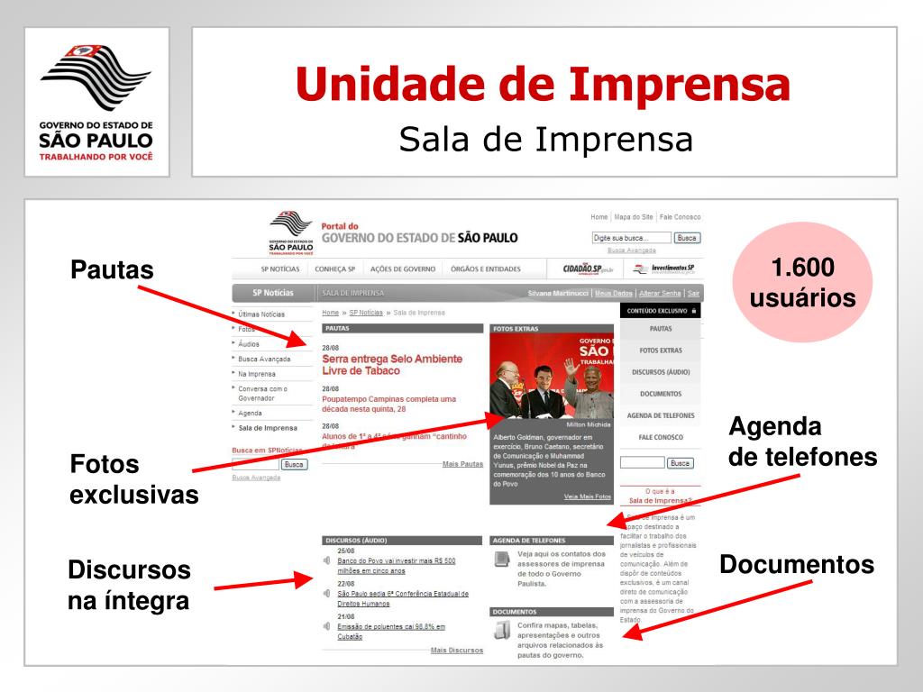 Unidade de Imprensa Sala de Imprensa 1.600usuários Pautas Agenda de telefones Fotos exclusivas Documentos Discursosna íntegra