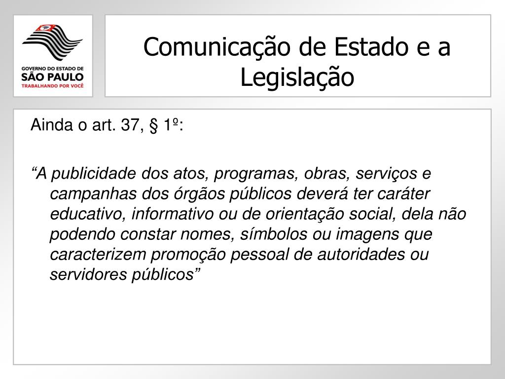 Comunicação de Estado e a Legislação Ainda o art. 37, § 1º: “A publicidade dos atos, programas, obras, serviços e campanhas dos órgãos públicos deverá ter caráter educativo, informativo ou de orientação social, dela não podendo constar nomes, símbolos ou imagens que caracterizem promoção pessoal de autoridades ou servidores públicos”