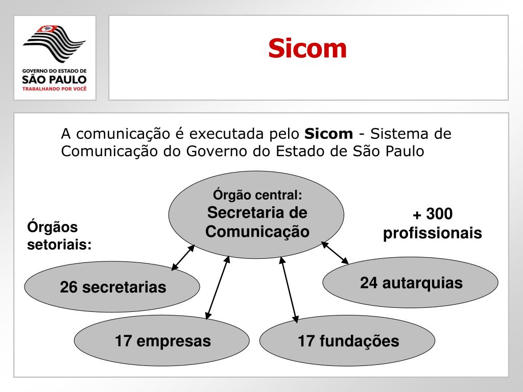 Sicom A comunicação é executada pelo Sicom - Sistema de Comunicação do Governo do Estado de São Paulo Órgão central:Secretaria deComunicação + 300 profissionais Órgãossetoriais: 24 autarquias 26 secretarias 17 empresas 17 fundações