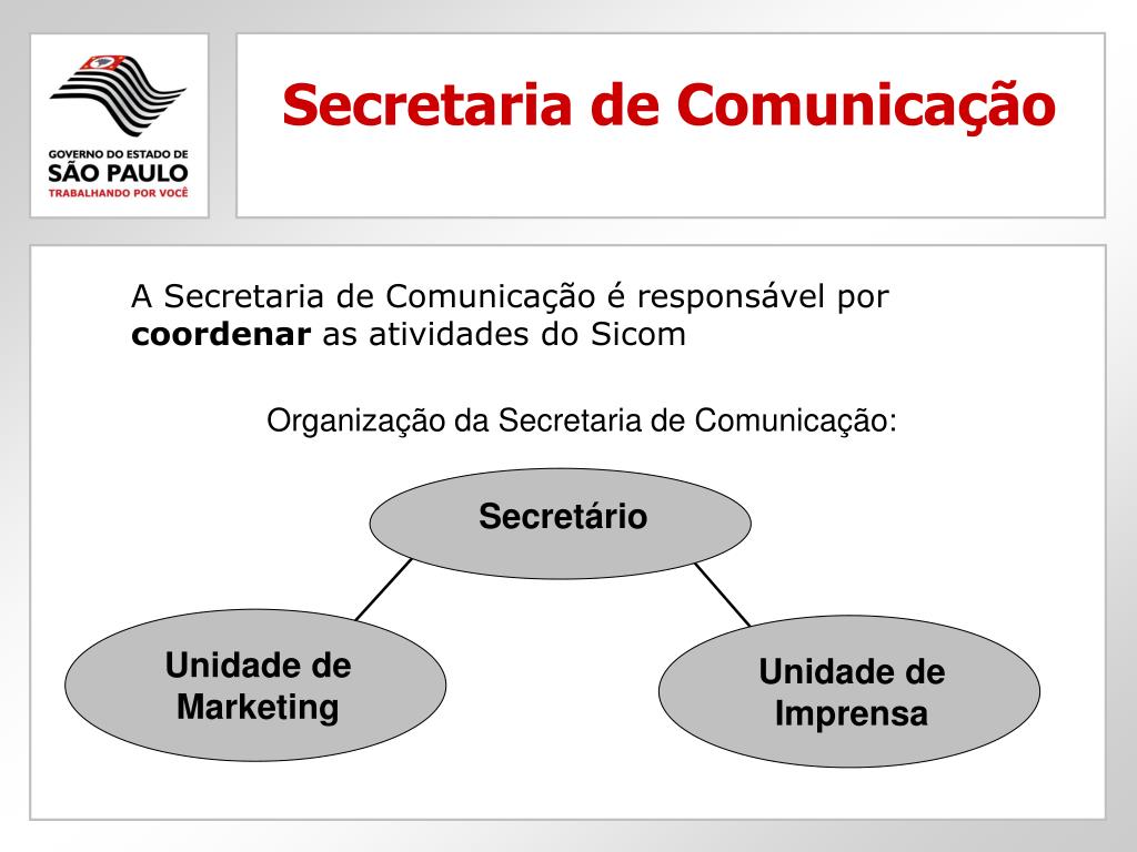 Secretaria de Comunicação A Secretaria de Comunicação é responsável por coordenar as atividades do Sicom Organização da Secretaria de Comunicação: Secretário Unidade deMarketing Unidade deImprensa