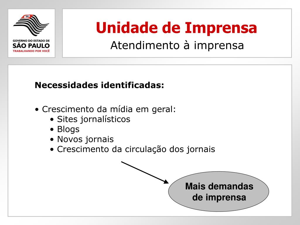 Unidade de Imprensa Atendimento à imprensa • Necessidades identificadas: • Crescimento da mídia em geral: • Sites jornalísticos • Blogs • Novos jornais • Crescimento da circulação dos jornais Mais demandasde imprensa