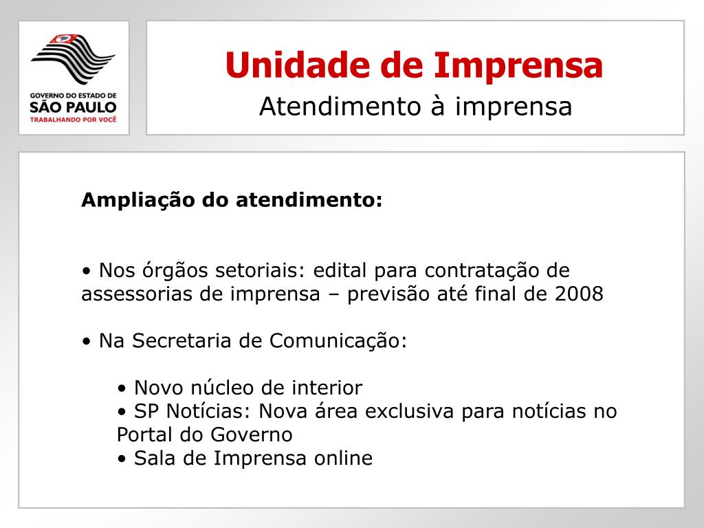 Unidade de Imprensa Atendimento à imprensa • Ampliação do atendimento: • Nos órgãos setoriais: edital para contratação de assessorias de imprensa – previsão até final de 2008 • Na Secretaria de Comunicação: • Novo núcleo de interior • SP Notícias: Nova área exclusiva para notícias no Portal do Governo • Sala de Imprensa online