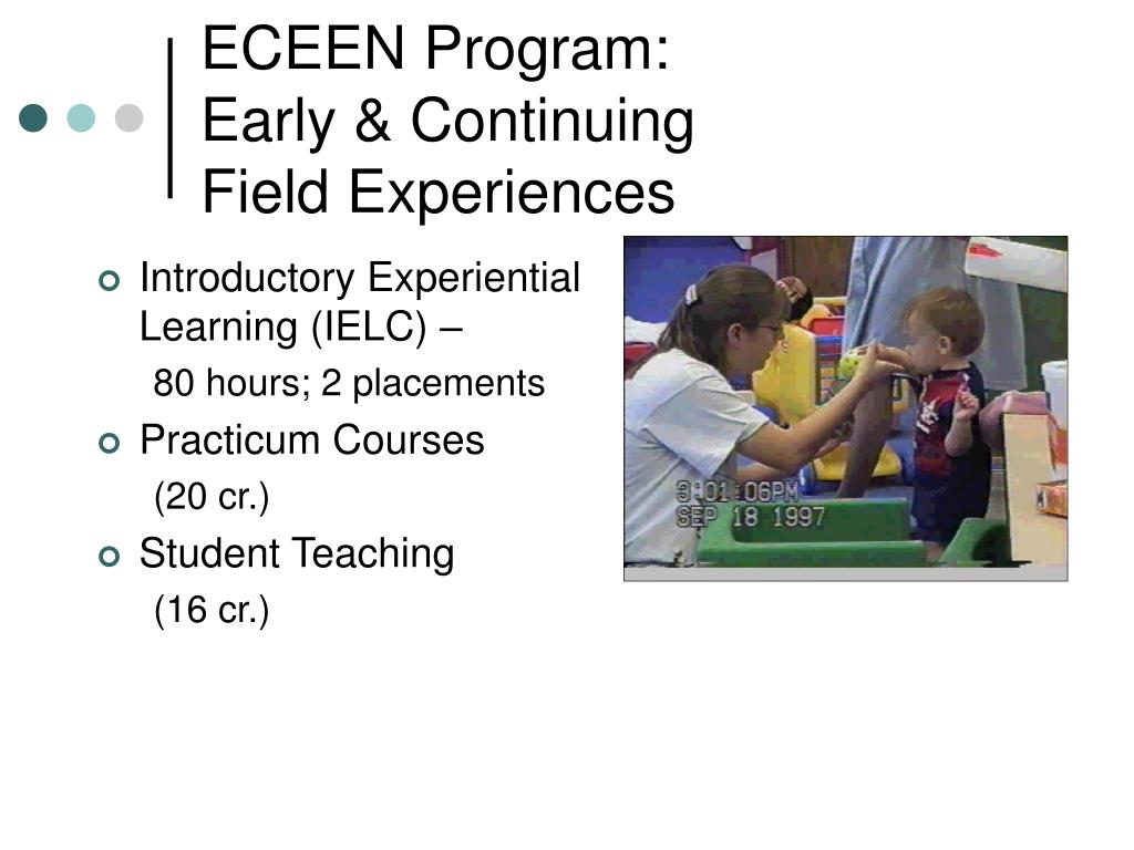 ECEEN Program: Early & Continuing Field Experiences • Introductory Experiential Learning (IELC) – 80 hours; 2 placements • Practicum Courses (20 cr.) • Student Teaching (16 cr.)