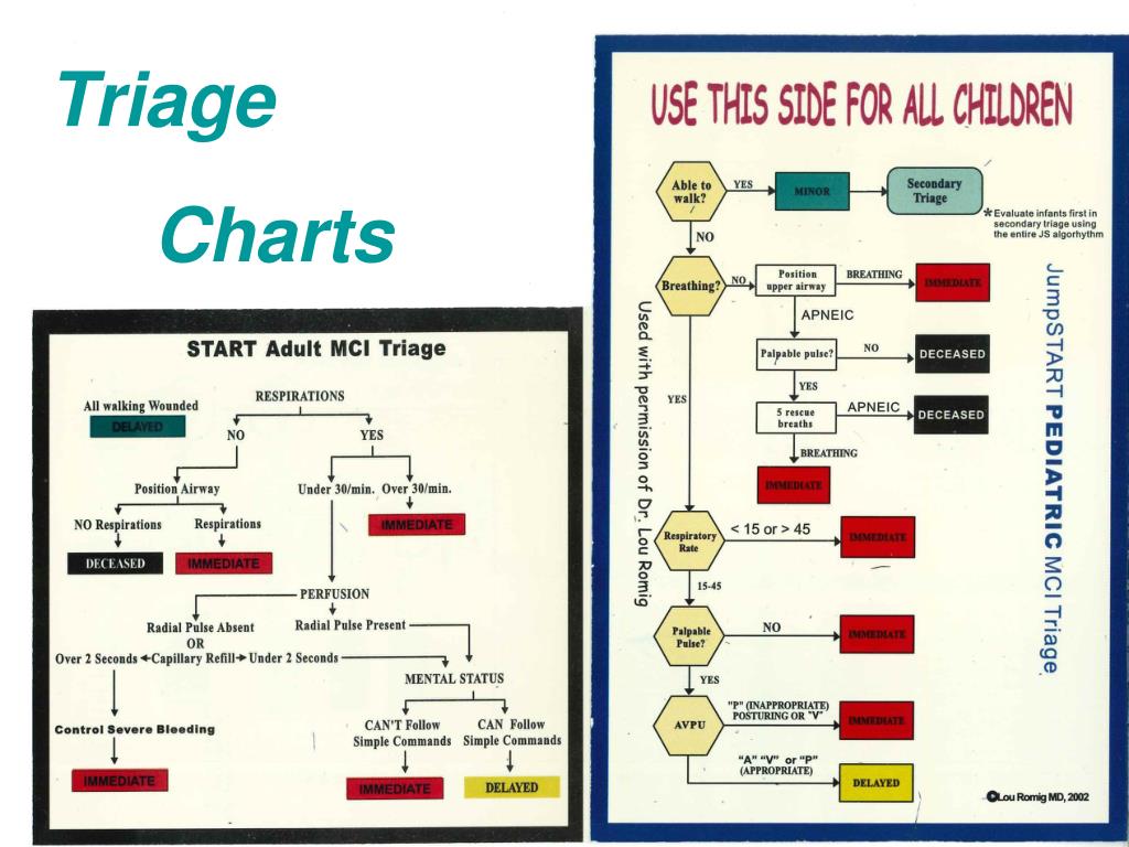 Triage Officer • 30 second eval of each patient. • Walking wounded - Green • R >30 Red • P No Rad Pulse or > 2 sec Cap refill-Red • M Can not follow simple command - Y • Tag Vs Band • Second Sweep or Assistant place name • Give count to EMS chief