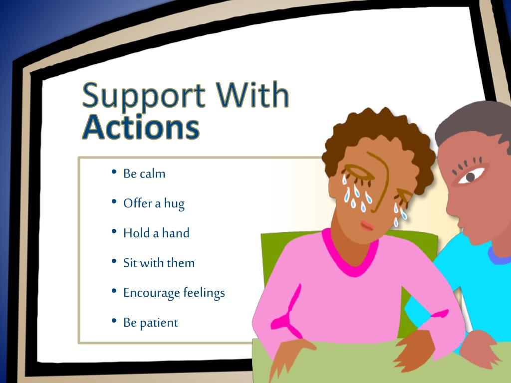 Support With Actions Be calm Offer a hug Hold a hand Sit with them Encourage feelings Be patient