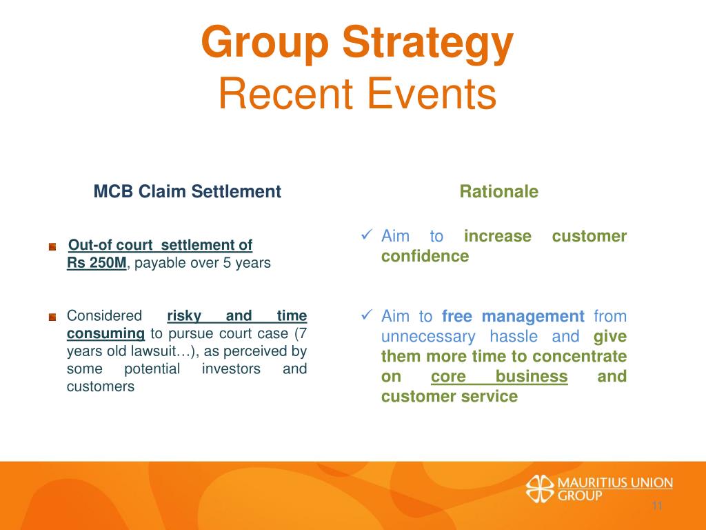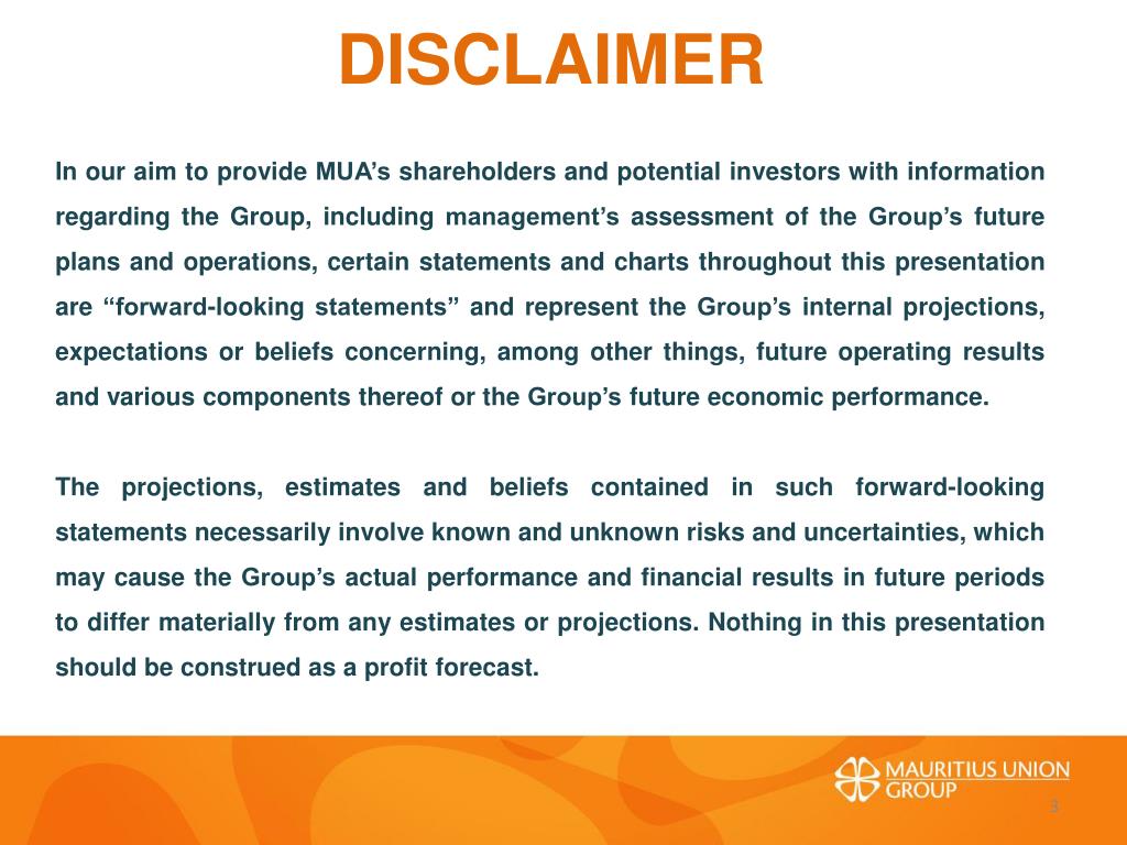 WELCOME. Analysts’ Meeting. 29 August 2011. This presentation will be available on www.mauritiusuniongroup.com. DISCLAIMER.