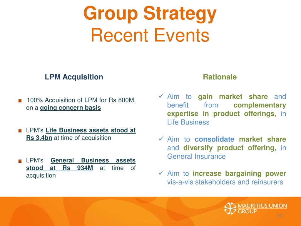 Group Strategy Recent Events LPM Acquisition Rationale • Aim to gain market share and benefit from complementary expertise in product offerings, in Life Business • Aim to consolidate market share anddiversify product offering, in General Insurance • Aim to increase bargaining power vis-a-vis stakeholders and reinsurers • 100% Acquisition of LPM for Rs 800M, on a going concern basis • LPM’s Life Business assets stood at Rs 3.4bnat time of acquisition • LPM’s General Business assets stood at Rs 934Mat time of acquisition
