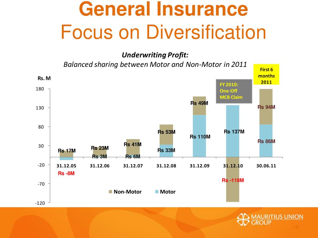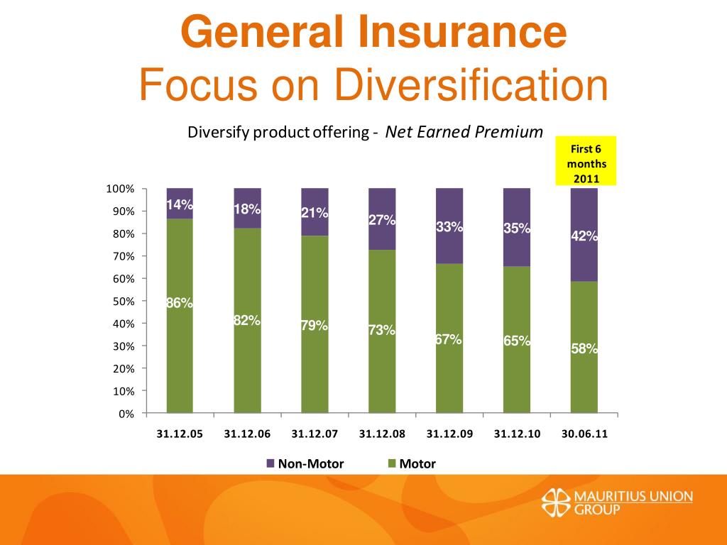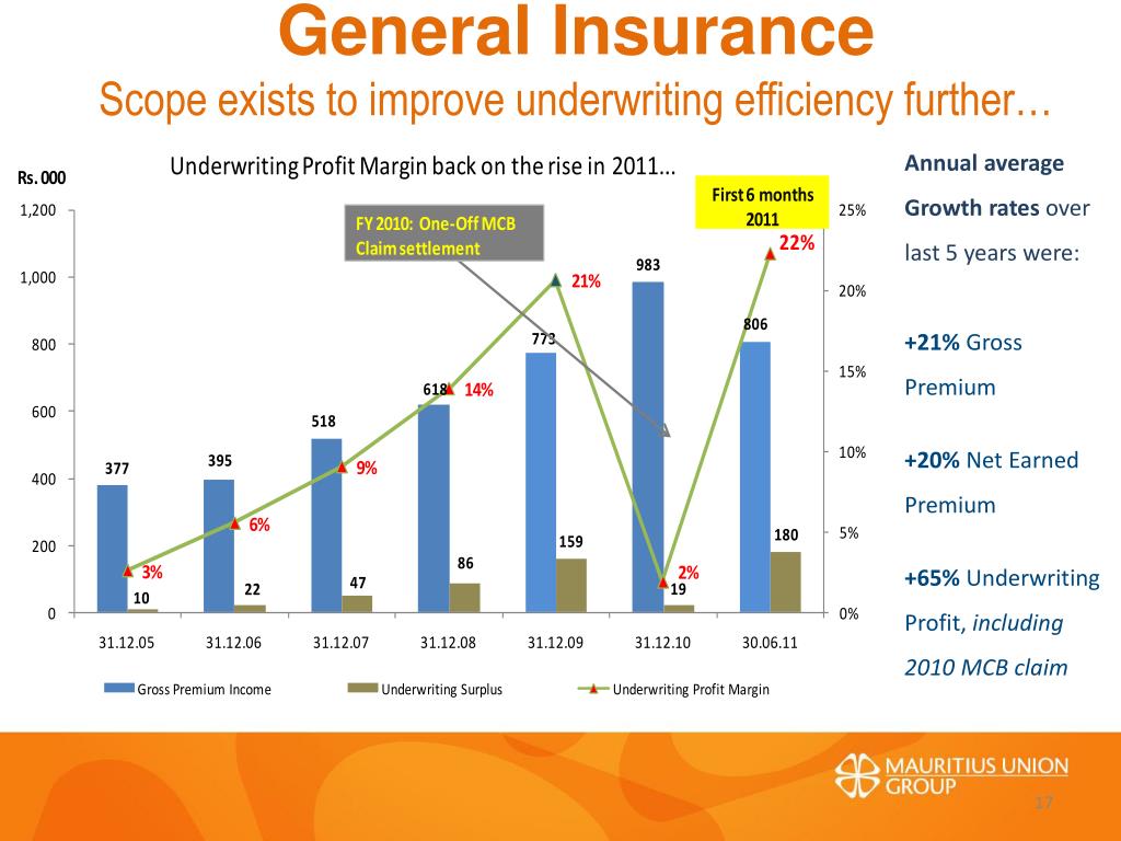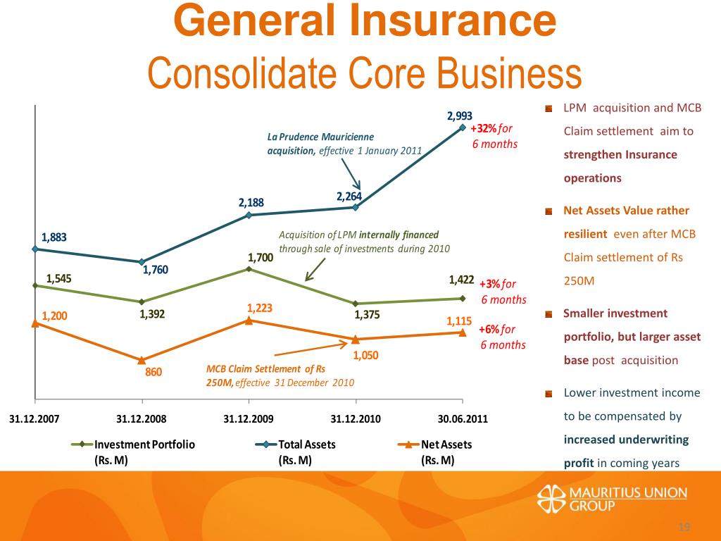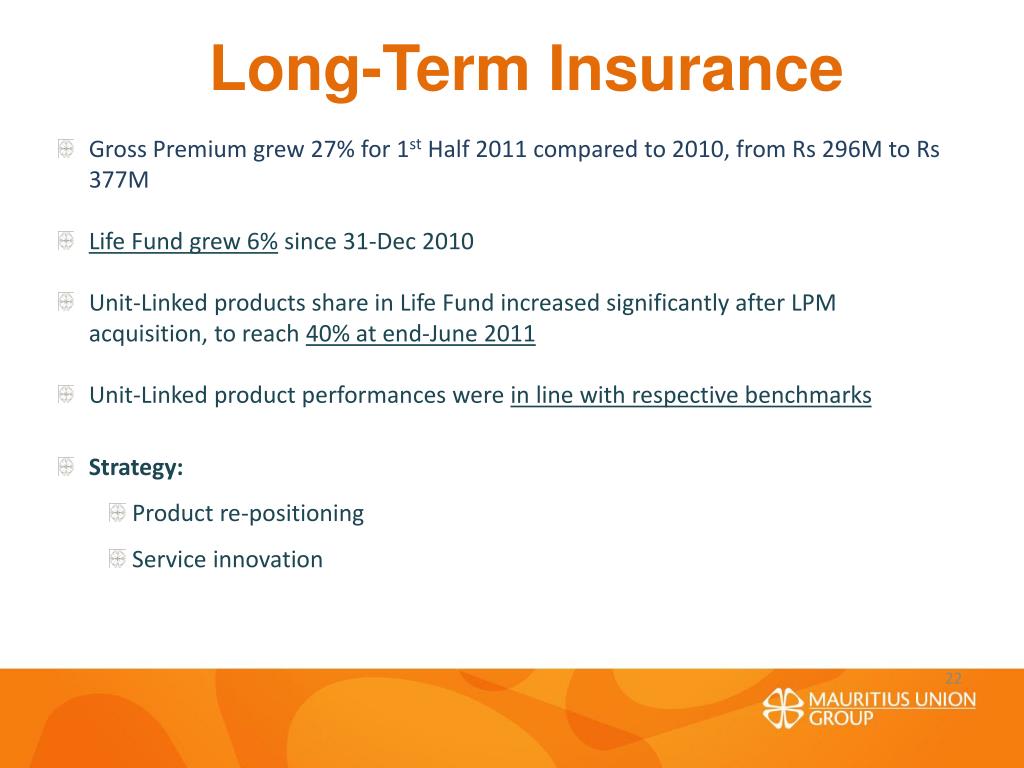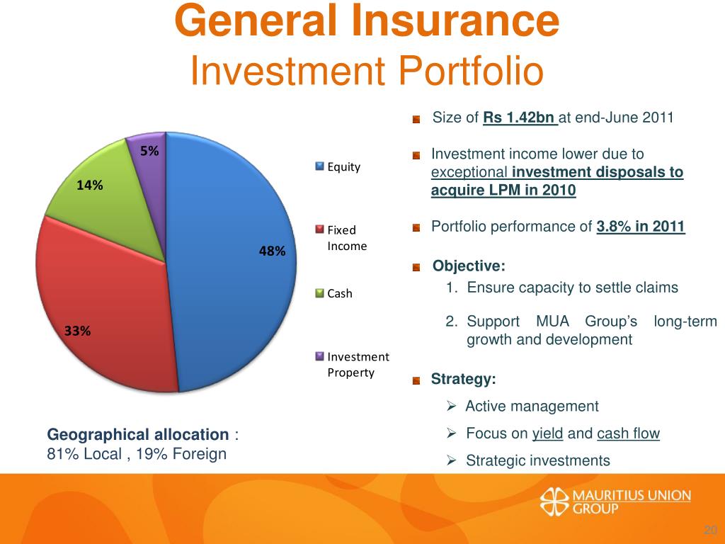 General Insurance Investment Portfolio • Size of Rs 1.42bn at end-June 2011 • Investment income lower due to exceptional investment disposals to acquire LPM in 2010 • Portfolio performance of 3.8% in 2011 • Objective: • Ensure capacity to settle claims • Support MUA Group’s long-term growth and development • Strategy: • Active management • Focus on yield and cash flow • Strategic investments Geographical allocation : 81% Local , 19% Foreign 20