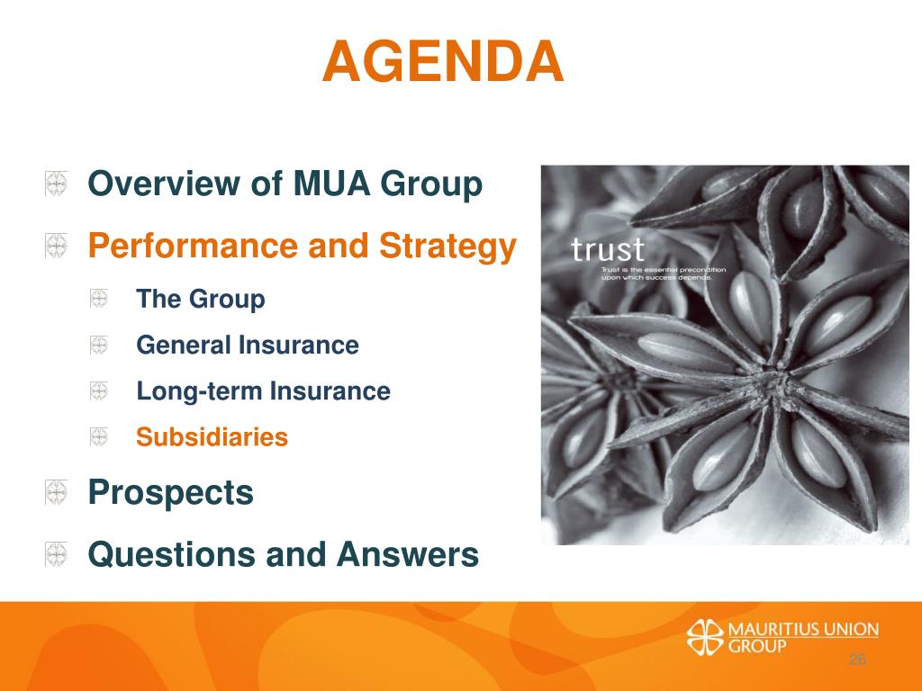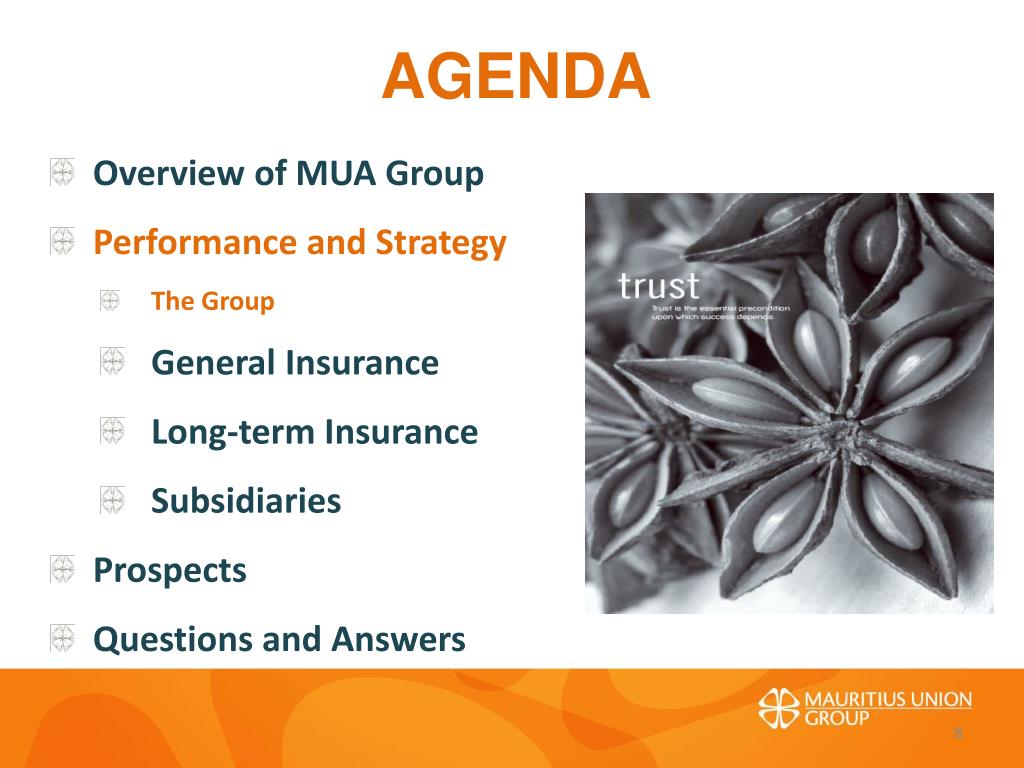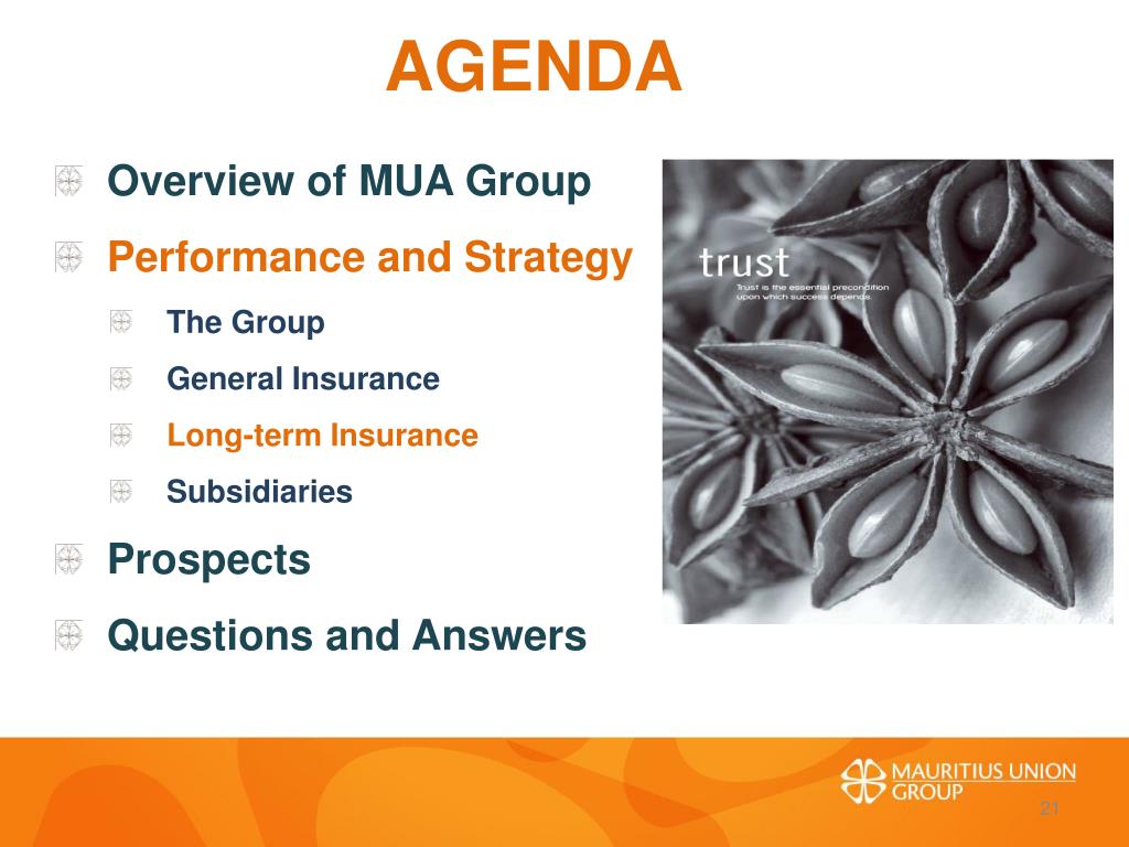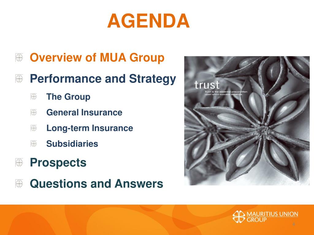 AGENDA • Overview of MUA Group • Performance and Strategy • The Group • General Insurance • Long-term Insurance • Subsidiaries • Prospects • Questions and Answers