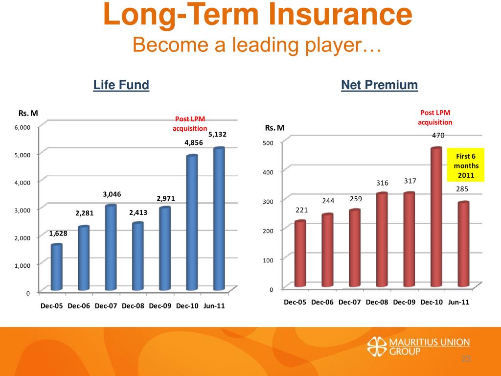 Long-Term Insurance • Gross Premium grew 27% for 1st Half 2011 compared to 2010, from Rs 296M to Rs 377M • Life Fund grew 6% since 31-Dec 2010 • Unit-Linked products share in Life Fund increased significantly after LPM acquisition, to reach 40% at end-June 2011 • Unit-Linked product performances were in line with respective benchmarks • Strategy: • Product re-positioning • Service innovation 22