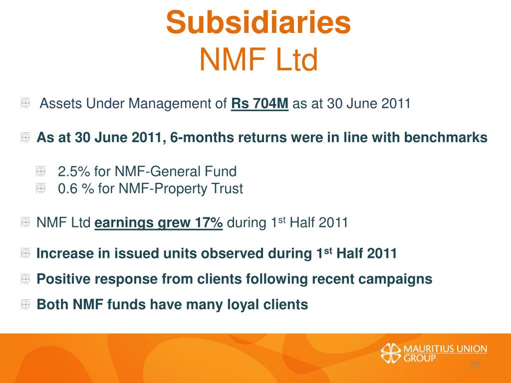Subsidiaries NMF Ltd • Assets Under Management of Rs 704Mas at 30 June 2011 • As at 30 June 2011, 6-months returns were in line with benchmarks • 2.5% for NMF-General Fund • 0.6 % for NMF-Property Trust • NMF Ltd earnings grew 17%during1st Half 2011 • Increase in issued units observed during 1st Half 2011 • Positive response from clients following recent campaigns • Both NMF funds have many loyal clients 27