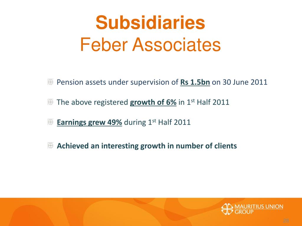 Subsidiaries Feber Associates • Pension assets under supervision of Rs 1.5bnon 30 June 2011 • The above registered growth of 6% in 1st Half 2011 • Earnings grew 49%during 1st Half 2011 • Achieved an interesting growth in number of clients 28