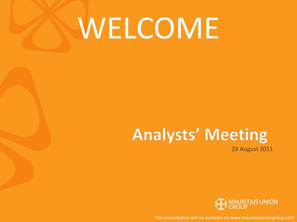 WELCOME Analysts’ Meeting 29 August 2011 This presentation will be available on www.mauritiusuniongroup.com