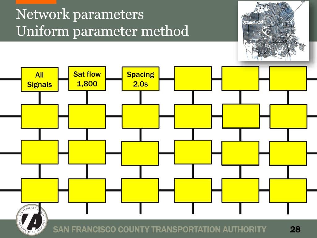 Network parametersUniform parameter method Sat flow 1,800 Spacing 2.0s All Signals SAN FRANCISCO COUNTY TRANSPORTATION AUTHORITY