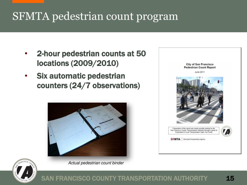 SFMTA pedestrian count program • 2-hour pedestrian counts at 50 locations (2009/2010) • Six automatic pedestrian counters (24/7 observations) Actual pedestrian count binder SAN FRANCISCO COUNTY TRANSPORTATION AUTHORITY