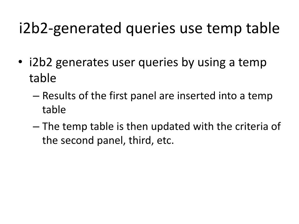 i2b2-generated queries use temp table • i2b2 generates user queries by using a temp table • Results of the first panel are inserted into a temp table • The temp table is then updated with the criteria of the second panel, third, etc.