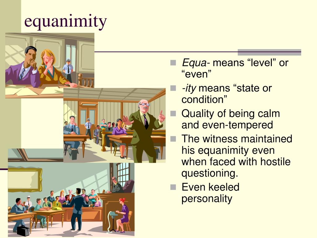 equanimity • Equa- means “level” or “even” • -ity means “state or condition” • Quality of being calm and even-tempered • The witness maintained his equanimity even when faced with hostile questioning. • Even keeled personality