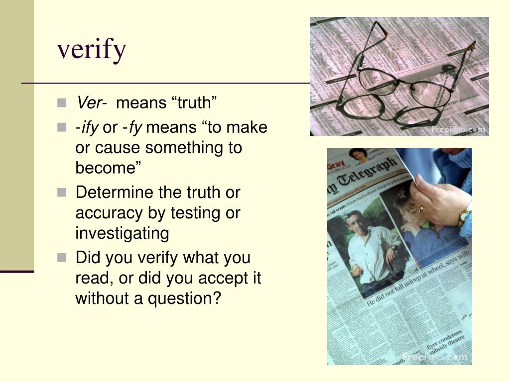 verify • Ver- means “truth” • -ify or -fy means “to make or cause something to become” • Determine the truth or accuracy by testing or investigating • Did you verify what you read, or did you accept it without a question?