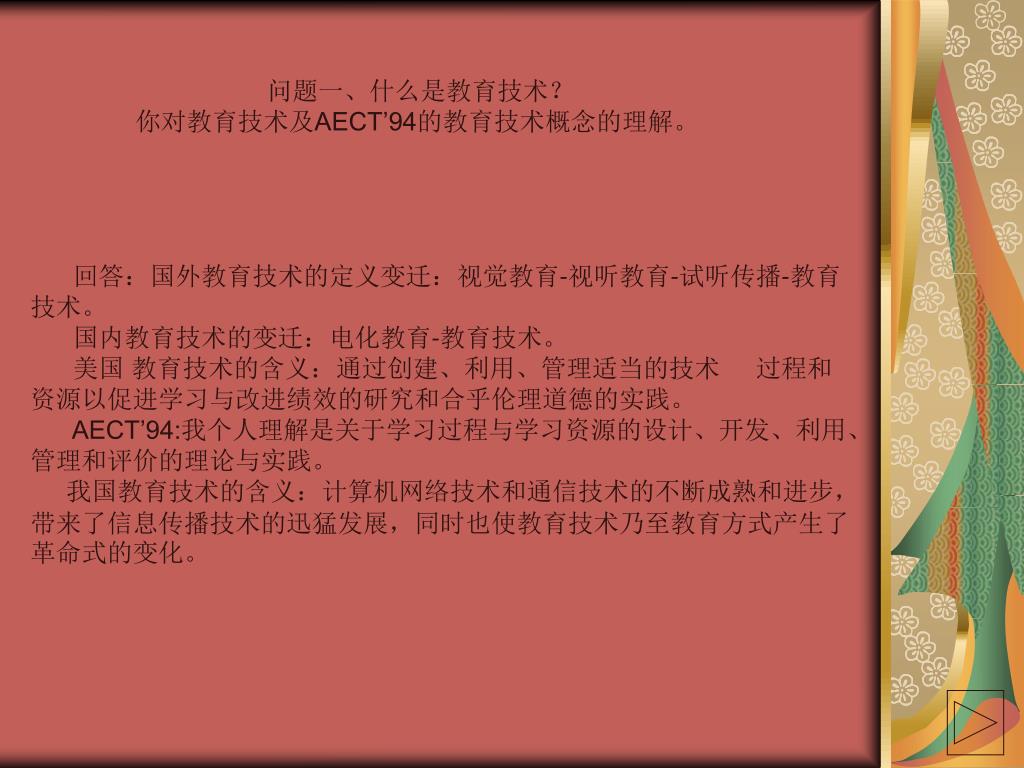 本人来自吉林市昌邑区东华小学,从教以来一直从事音乐教学工作,目前担任学校辅导员兼音乐教学工作 。. 作业目录: 问题一、什么是教育技术?你对教育技术及 AECT’94 的教育技术概念的理解。 问题二、你在教学中应用教育技术的情况如何?(如应用的情境、程度以及效果) 问题三、为什么要用教育技术?你认为教育技术对新课程改革会产生什么影响?. 问题一、什么是教育技术? 你对教育技术及 AECT’94 的教育技术概念的理解。. 回答:国外教育技术的定义变迁:视觉教育 - 视听教育 - 试听传播 - 教育 技术。