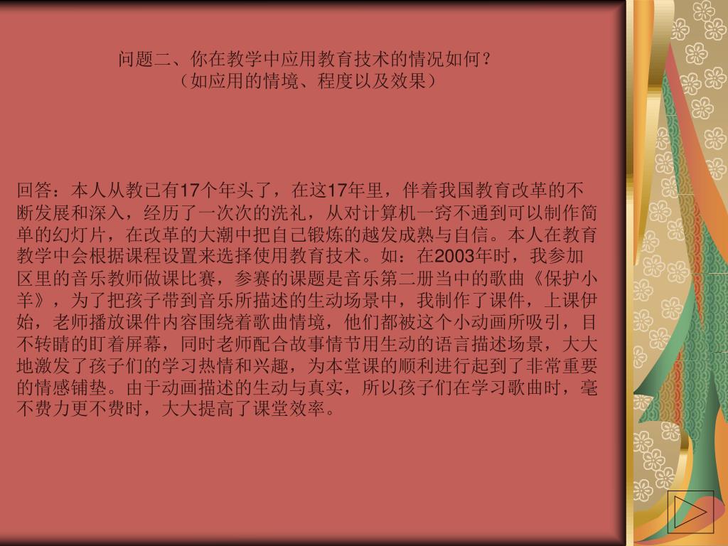 问题二、你在教学中应用教育技术的情况如何?问题二、你在教学中应用教育技术的情况如何? (如应用的情境、程度以及效果) 回答:本人从教已有17个年头了,在这17年里,伴着我国教育改革的不断发展和深入,经历了一次次的洗礼,从对计算机一窍不通到可以制作简单的幻灯片,在改革的大潮中把自己锻炼的越发成熟与自信。本人在教育教学中会根据课程设置来选择使用教育技术。如:在2003年时,我参加区里的音乐教师做课比赛,参赛的课题是音乐第二册当中的歌曲《保护小羊》,为了把孩子带到音乐所描述的生动场景中,我制作了课件,上课伊始,老师播放课件内容围绕着歌曲情境,他们都被这个小动画所吸引,目不转睛的盯着屏幕,同时老师配合故事情节用生动的语言描述场景,大大地激发了孩子们的学习热情和兴趣,为本堂课的顺利进行起到了非常重要的情感铺垫。由于动画描述的生动与真实,所以孩子们在学习歌曲时,毫不费力更不费时,大大提高了课堂效率。