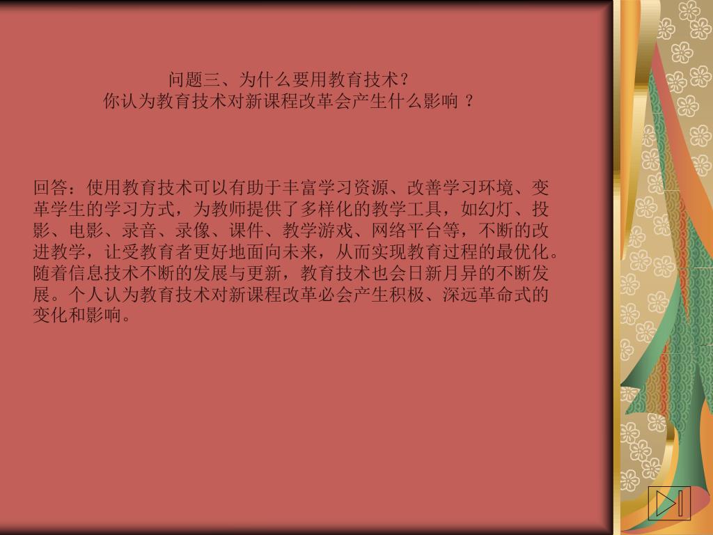 问题三、为什么要用教育技术? 你认为教育技术对新课程改革会产生什么影响 ? 回答:使用教育技术可以有助于丰富学习资源、改善学习环境、变革学生的学习方式,为教师提供了多样化的教学工具,如幻灯、投影、电影、录音、录像、课件、教学游戏、网络平台等,不断的改进教学,让受教育者更好地面向未来,从而实现教育过程的最优化。随着信息技术不断的发展与更新,教育技术也会日新月异的不断发展。个人认为教育技术对新课程改革必会产生积极、深远革命式的变化和影响。
