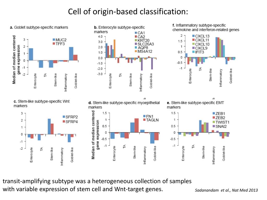 Cell of origin-based classification: transit-amplifying subtype was a heterogeneous collection of samples with variable expression of stem cell and Wnt-target genes. Sadanandam et al., Nat Med 2013