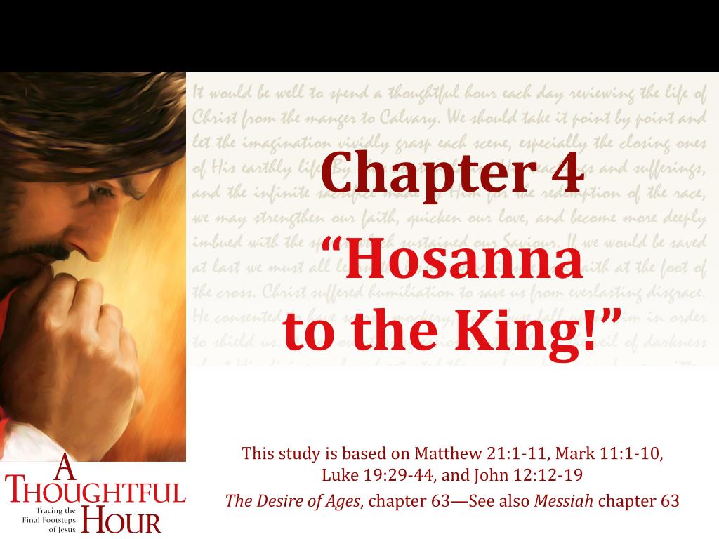 Chapter 4 “Hosanna to the King!”. This study is based on Matthew 21:1-11, Mark 11:1-10, Luke 19:29-44, and John 12:12-19 The Desire of Ages , chapter 63—See also Messiah chapter 63. Why did Jesus allow this royal procession?. The Desire of Ages 571-5 and Messiah 312-3.