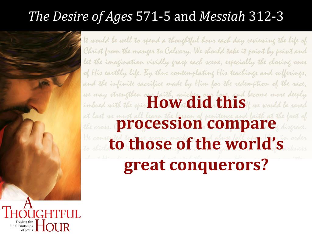 How did thisprocession compareto those of the world’s great conquerors? The Desire of Ages 571-5 and Messiah 312-3
