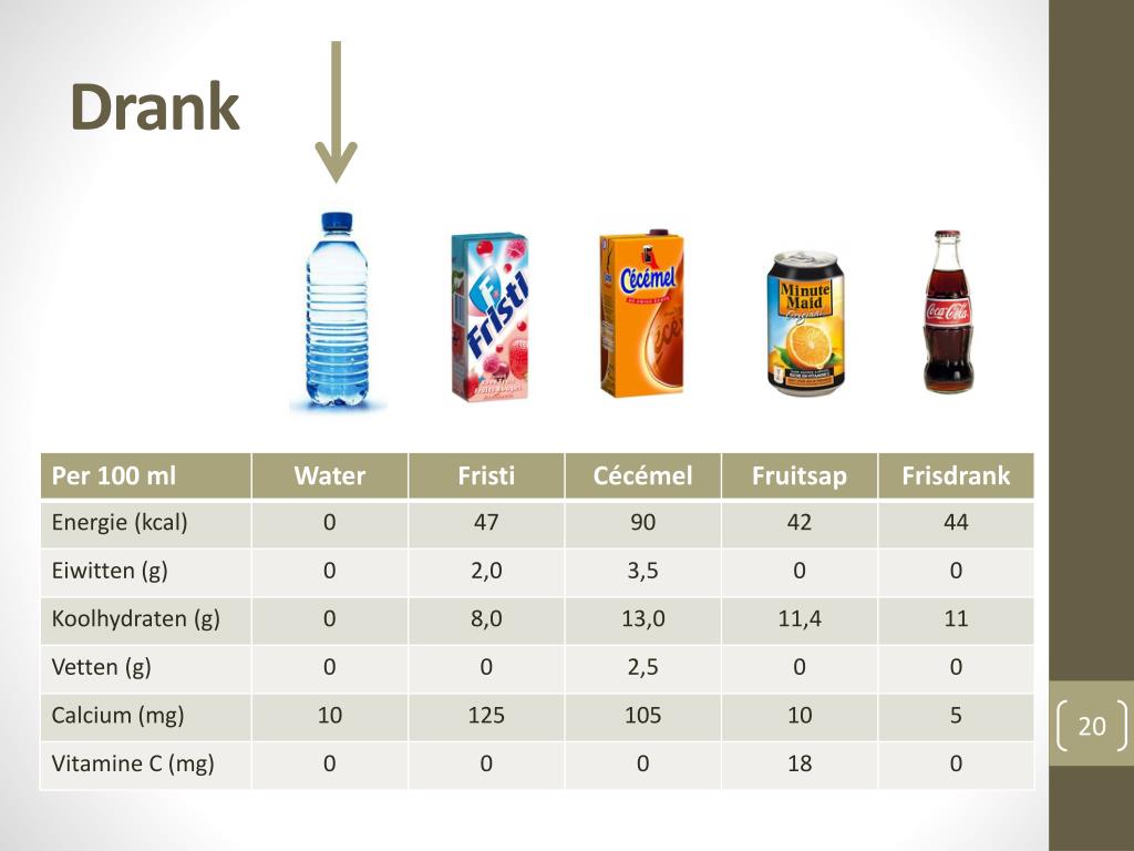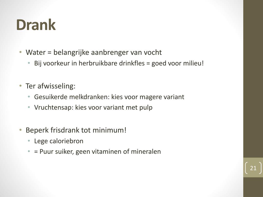 Drank • Water = belangrijke aanbrenger van vocht • Bij voorkeur in herbruikbare drinkfles = goed voor milieu! • Ter afwisseling: • Gesuikerde melkdranken: kies voor magere variant • Vruchtensap: kies voor variant met pulp • Beperk frisdrank tot minimum! • Lege caloriebron • = Puur suiker, geen vitaminen of mineralen