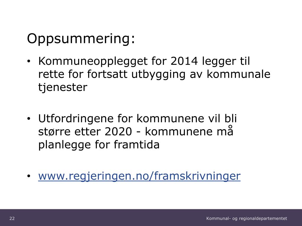 Oppsummering: • Kommuneopplegget for 2014 legger til rette for fortsatt utbygging av kommunale tjenester • Utfordringene for kommunene vil bli større etter 2020 - kommunene må planlegge for framtida • www.regjeringen.no/framskrivninger