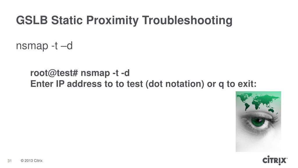 GSLB Static Proximity Troubleshooting nsmap -t –d root@test# nsmap -t -d Enter IP address to to test (dot notation) or q to exit: