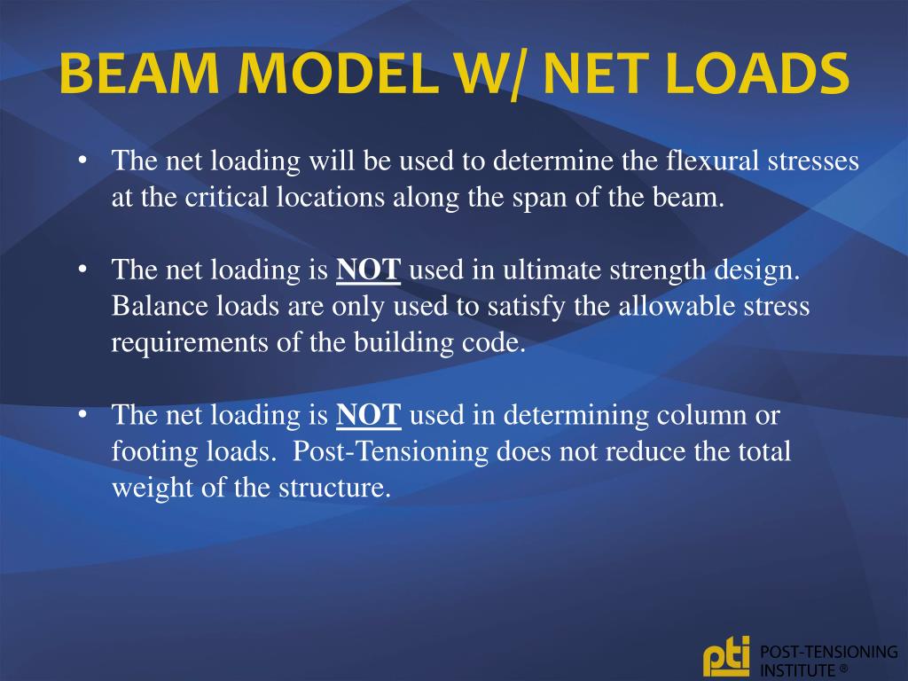 Beam Model w/ Net Loads • The net loading will be used to determine the flexural stresses at the critical locations along the span of the beam. • The net loading is NOTused in ultimate strength design. Balance loads are only used to satisfy the allowable stress requirements of the building code. • The net loading is NOT used in determining column or footing loads. Post-Tensioning does not reduce the total weight of the structure.