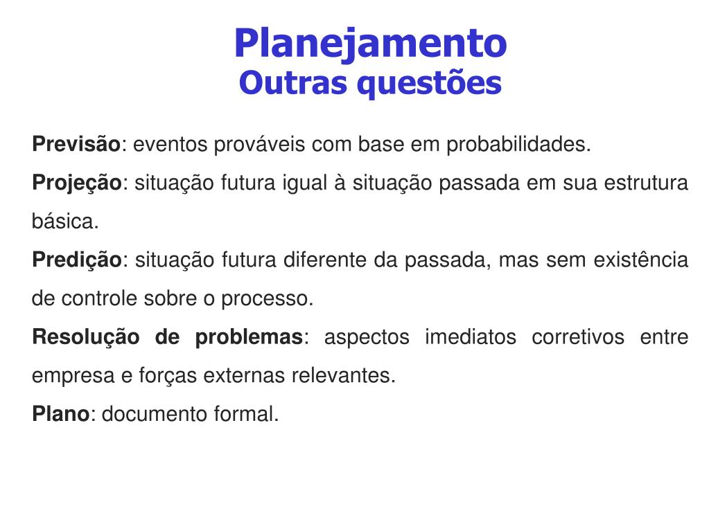 Planejamento Outras questões Planejamento Outras questões Previsão: eventos prováveis com base em probabilidades. Projeção: situação futura igual à situação passada em sua estrutura básica. Predição: situação futura diferente da passada, mas sem existência de controle sobre o processo. Resolução de problemas: aspectos imediatos corretivos entre empresa e forças externas relevantes. Plano: documento formal.