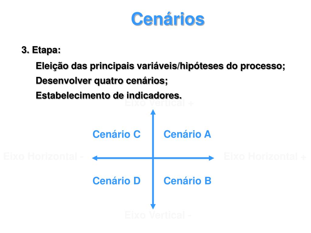 Cenários 3. Etapa: Eleição das principais variáveis/hipóteses do processo; Desenvolver quatro cenários; Estabelecimento de indicadores. Eixo Vertical + Cenário A Cenário C Eixo Horizontal - Eixo Horizontal + Cenário D Cenário B Eixo Vertical -