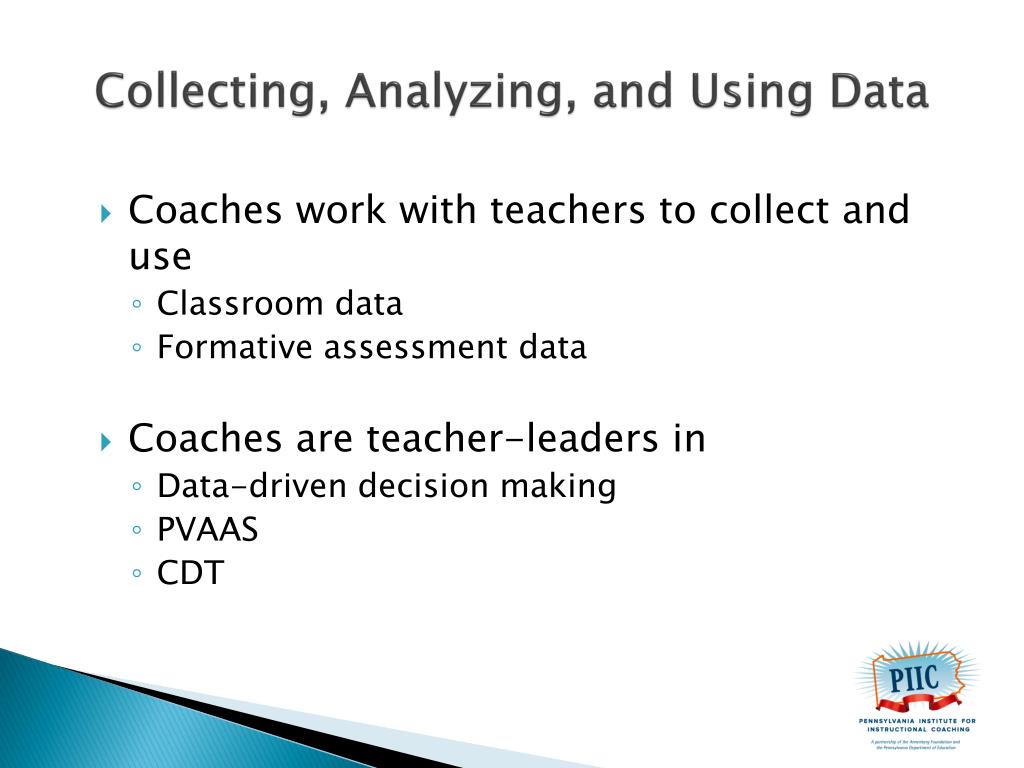 Collecting, Analyzing, and Using Data • Coaches work with teachers to collect and use • Classroom data • Formative assessment data • Coaches are teacher-leaders in • Data-driven decision making • PVAAS • CDT