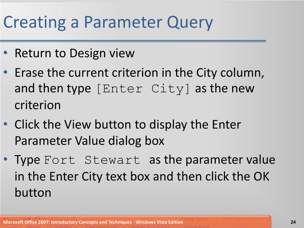 Creating a Parameter Query • Return to Design view • Erase the current criterion in the City column, and then type [Enter City] as the new criterion • Click the View button to display the Enter Parameter Value dialog box • Type Fort Stewart as the parameter value in the Enter City text box and then click the OK button Microsoft Office 2007: Introductory Concepts and Techniques - Windows Vista Edition