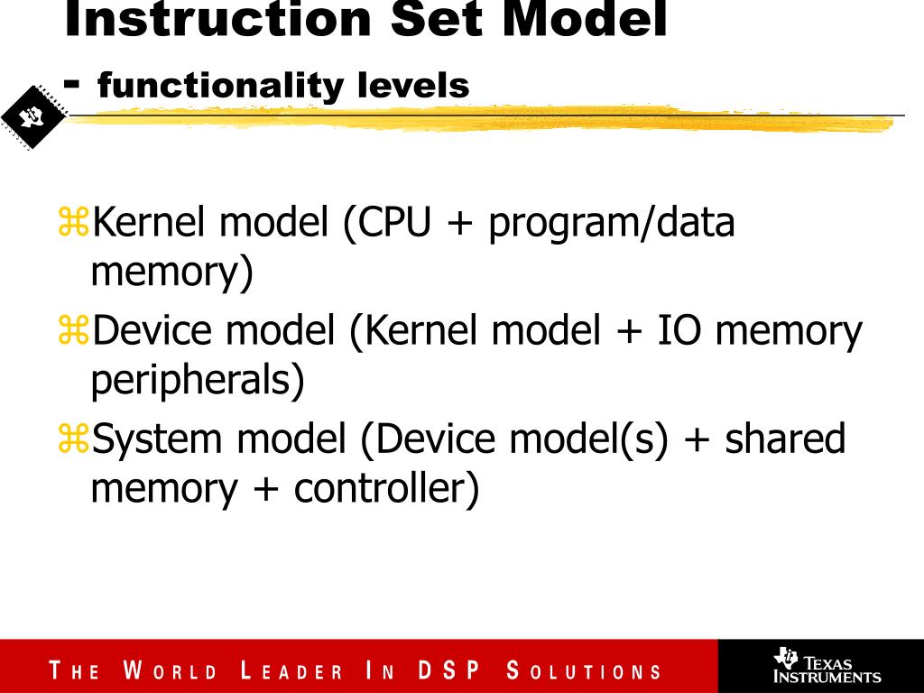 Instruction Set Model - functionality levels • Kernel model (CPU + program/data memory) • Device model (Kernel model + IO memory peripherals) • System model (Device model(s) + shared memory + controller)
