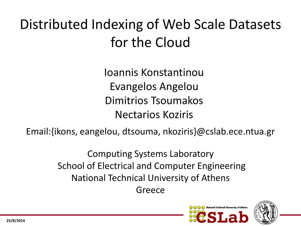 Ioannis Konstantinou Evangelos Angelou Dimitrios Tsoumakos Nectarios Koziris. Distributed Indexing of Web Scale Datasets for the Cloud. Email:{ikons, eangelou, dtsouma, nkoziris}@cslab.ece.ntua.gr. Computing Systems Laboratory School of Electrical and Computer Engineering