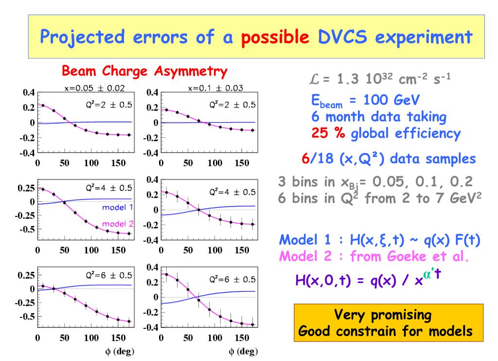 Projected errors of a possible DVCS experiment Beam Charge Asymmetry L = 1.3 1032 cm-2 s-1 Ebeam = 100 GeV 6 month data taking 25 % global efficiency 6/18 (x,Q²) data samples 3 bins in xBj= 0.05, 0.1, 0.2 6 bins in Q2 from 2 to 7 GeV2 Model 1 : H(x,ξ,t) ~ q(x) F(t) Model 2 :from Goeke et al. H(x,0,t) = q(x) / xα’t Very promising Good constrain for models