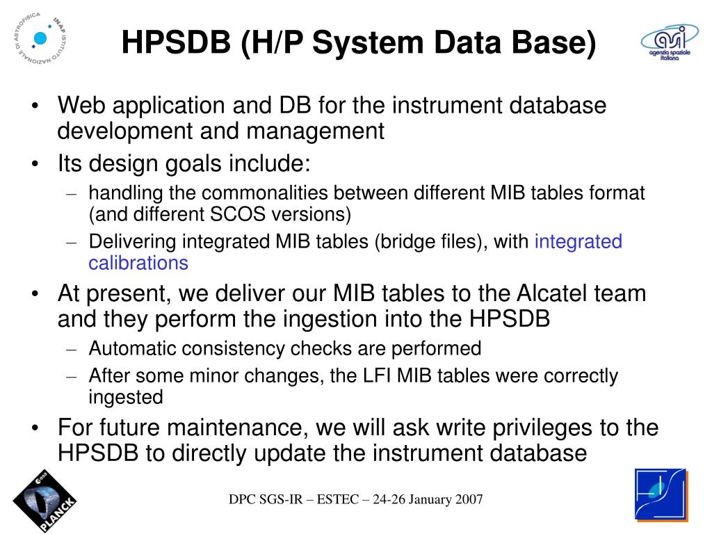HPSDB (H/P System Data Base) • Web application and DB for the instrument database development and management • Its design goals include: • handling the commonalities between different MIB tables format (and different SCOS versions) • Delivering integrated MIB tables (bridge files), with integrated calibrations • At present, we deliver our MIB tables to the Alcatel team and they perform the ingestion into the HPSDB • Automatic consistency checks are performed • After some minor changes, the LFI MIB tables were correctly ingested • For future maintenance, we will ask write privileges to the HPSDB to directly update the instrument database