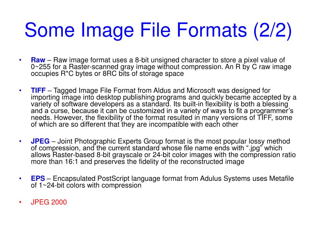Some Image File Formats (2/2) • Raw – Raw image format uses a 8-bit unsigned character to store a pixel value of 0~255 for a Raster-scanned gray image without compression. An R by C raw image occupies R*C bytes or 8RC bits of storage space • TIFF – Tagged Image File Format from Aldus and Microsoft was designed for importing image into desktop publishing programs and quickly became accepted by a variety of software developers as a standard. Its built-in flexibility is both a blessing and a curse, because it can be customized in a variety of ways to fit a programmer’s needs. However, the flexibility of the format resulted in many versions of TIFF, some of which are so different that they are incompatible with each other • JPEG – Joint Photographic Experts Group format is the most popular lossy method of compression, and the current standard whose file name ends with “.jpg” which allows Raster-based 8-bit grayscale or 24-bit color images with the compression ratio more than 16:1 and preserves the fidelity of the reconstructed image • EPS – Encapsulated PostScript language format from Adulus Systems uses Metafile of 1~24-bit colors with compression • JPEG 2000