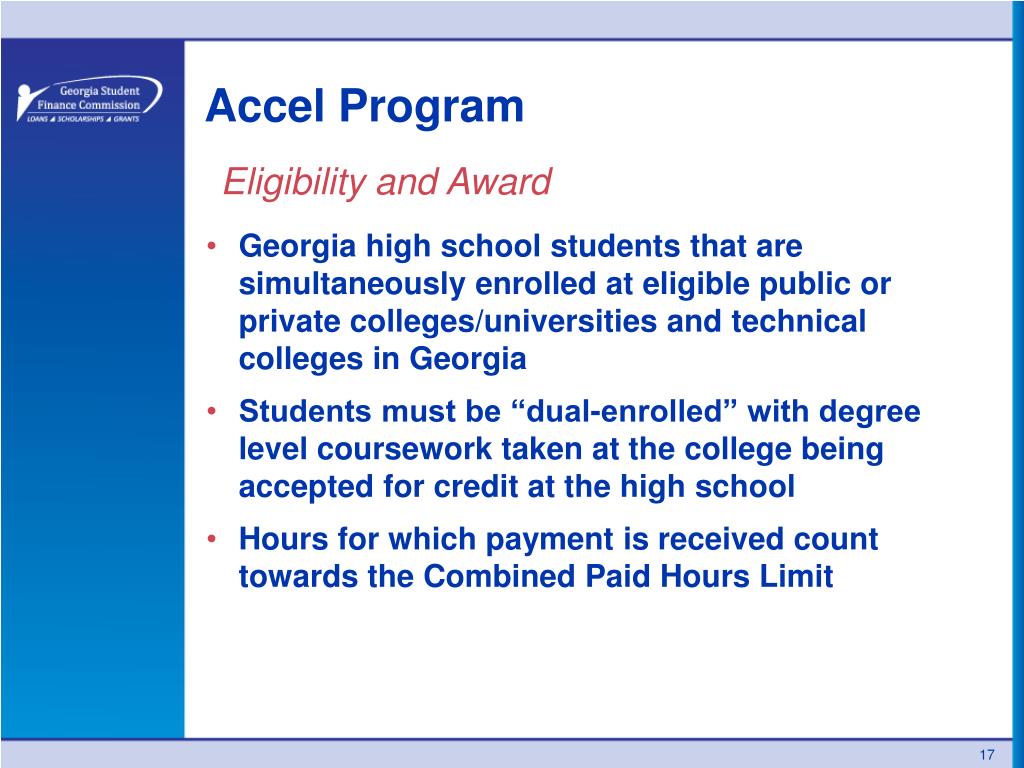 Accel Program Eligibility and Award Georgia high school students that are simultaneously enrolled at eligible public or private colleges/universities and technical colleges in Georgia Students must be “dual-enrolled” with degree level coursework taken at the college being accepted for credit at the high school Hours for which payment is received count towards the Combined Paid Hours Limit