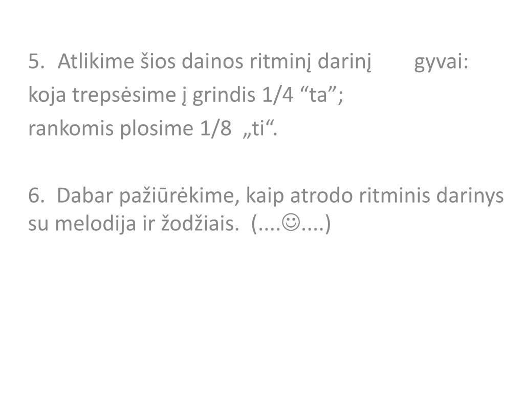 Atlikime šios dainos ritminį darinį gyvai: koja trepsėsime į grindis 1/4 “ta”; rankomis plosime 1/8 „ti“. 6. Dabar pažiūrėkime, kaip atrodo ritminis darinys su melodija ir žodžiais. (........)