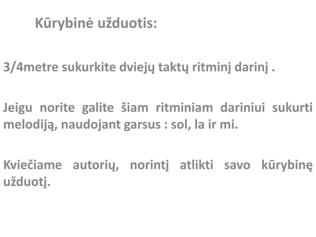 Kūrybinė užduotis: 3/4metre sukurkite dviejų taktų ritminį darinį . Jeigu norite galite šiam ritminiam dariniui sukurti melodiją, naudojant garsus : sol, lair mi. Kviečiame autorių, norintį atlikti savo kūrybinę užduotį.