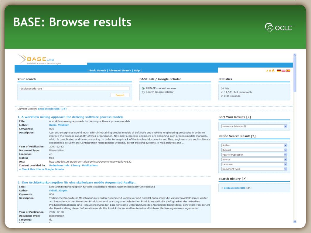 DDC already associated with a large number of resources • WorldCat • ~25% of WorldCat records include explicit Dewey numbers plus more derived using FRBR work sets • Number is growing, e.g., Deutsche Nationalbibliothek is now adding Dewey numbers to WorldCat nearly at the same rate as the Library of Congress • Other utilities and databases, e.g., BIBSYS, NORART, NORBOK • Digital libraries, e.g., World Digital Library