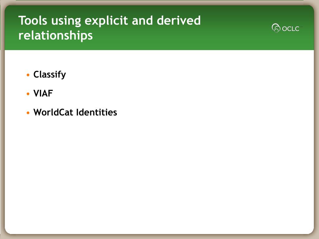 Tools using explicit and derived relationships • Classify • VIAF • WorldCat Identities