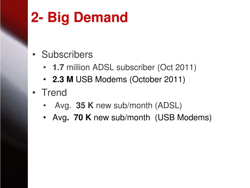 2- Big Demand • Subscribers • 1.7 million ADSL subscriber (Oct 2011) • 2.3 M USB Modems (October 2011) • Trend • Avg. 35 K new sub/month (ADSL) • Avg. 70 K new sub/month (USB Modems)